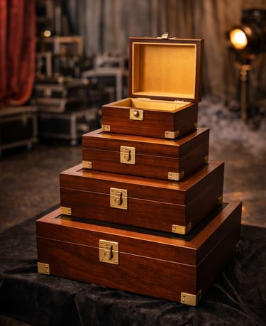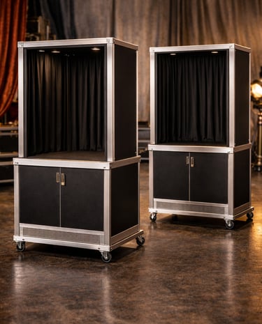 Custom-built stage booths engineered for durability, portability, and structural stability, featuring clean theatrical finishes and tailored configurations designed to meet the specific demands of professional performance environments.