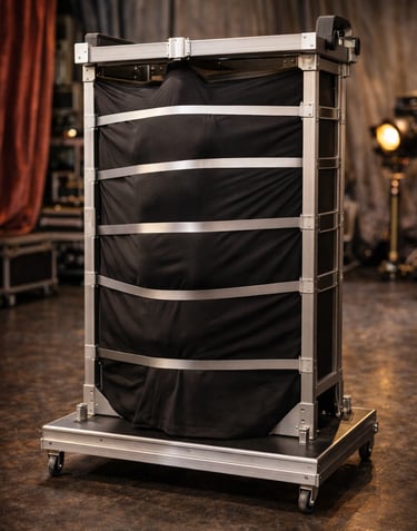 Custom engineered illusion cabinet with a precision-built silent hinge system, reinforced touring frame, and smooth internal mechanics designed for durability, stability, and reliable performance in professional stage environments.